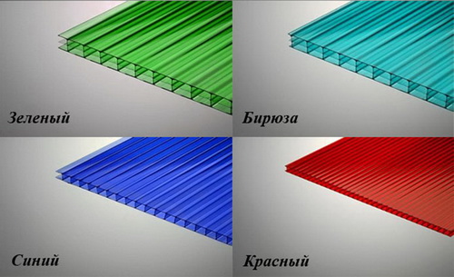 Выпускается сотовый поликарбонат "Sotek" в разных оттенках: зеленых, синих, желтых, красных, бирюзовых, молочных и других, также может быть прозрачным.