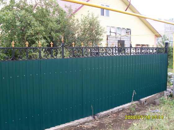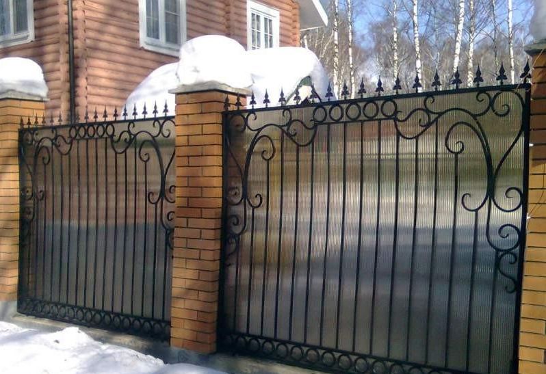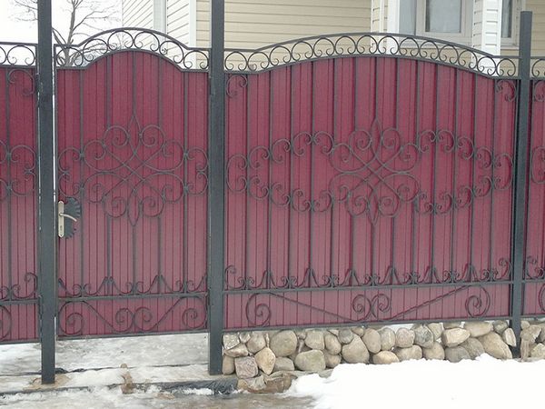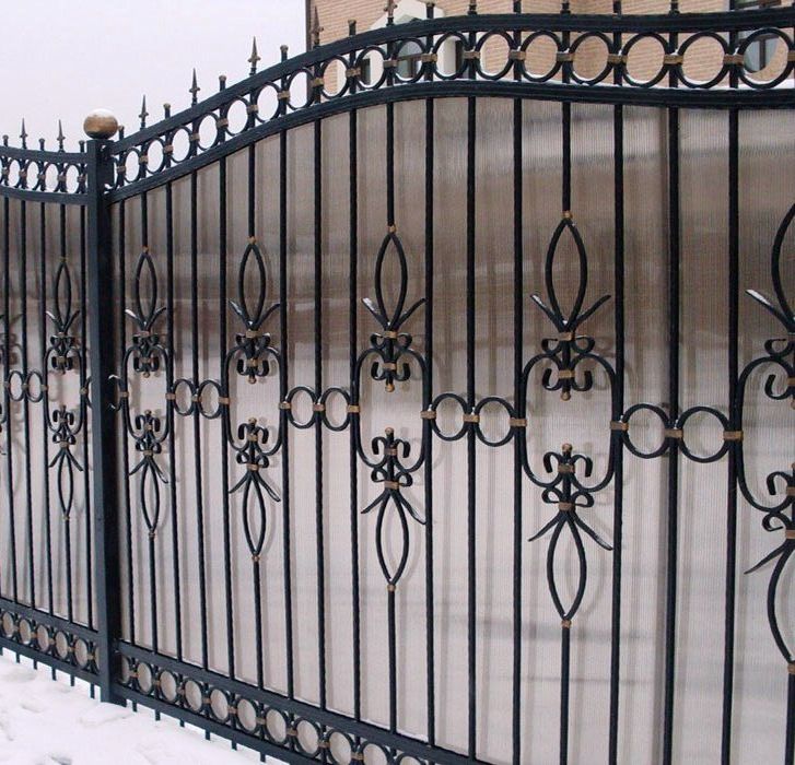 • Многих смущает тот факт, что кованые заборы для дома не предполагают уединения и неприкосновенности частной жизни, поскольку являются «прозрачными» (резными) изделиями. Решением станет беспросветная конструкция, которая также довольно популярна у владельцев загородных домов, в качестве материала закрывающего Вашу личную жизнь можно использовать поликарбонат, профилированный лист либо дерево.
